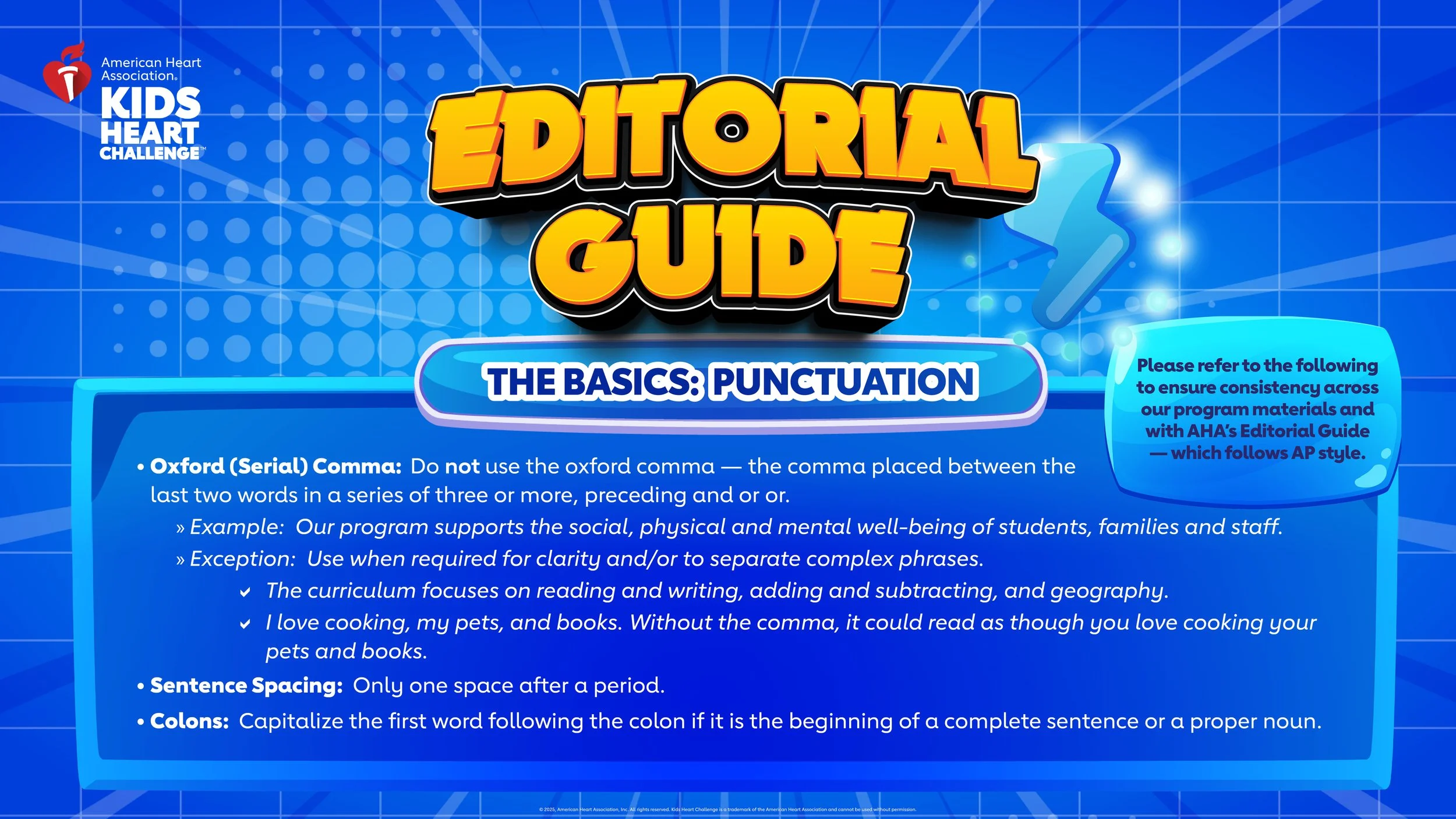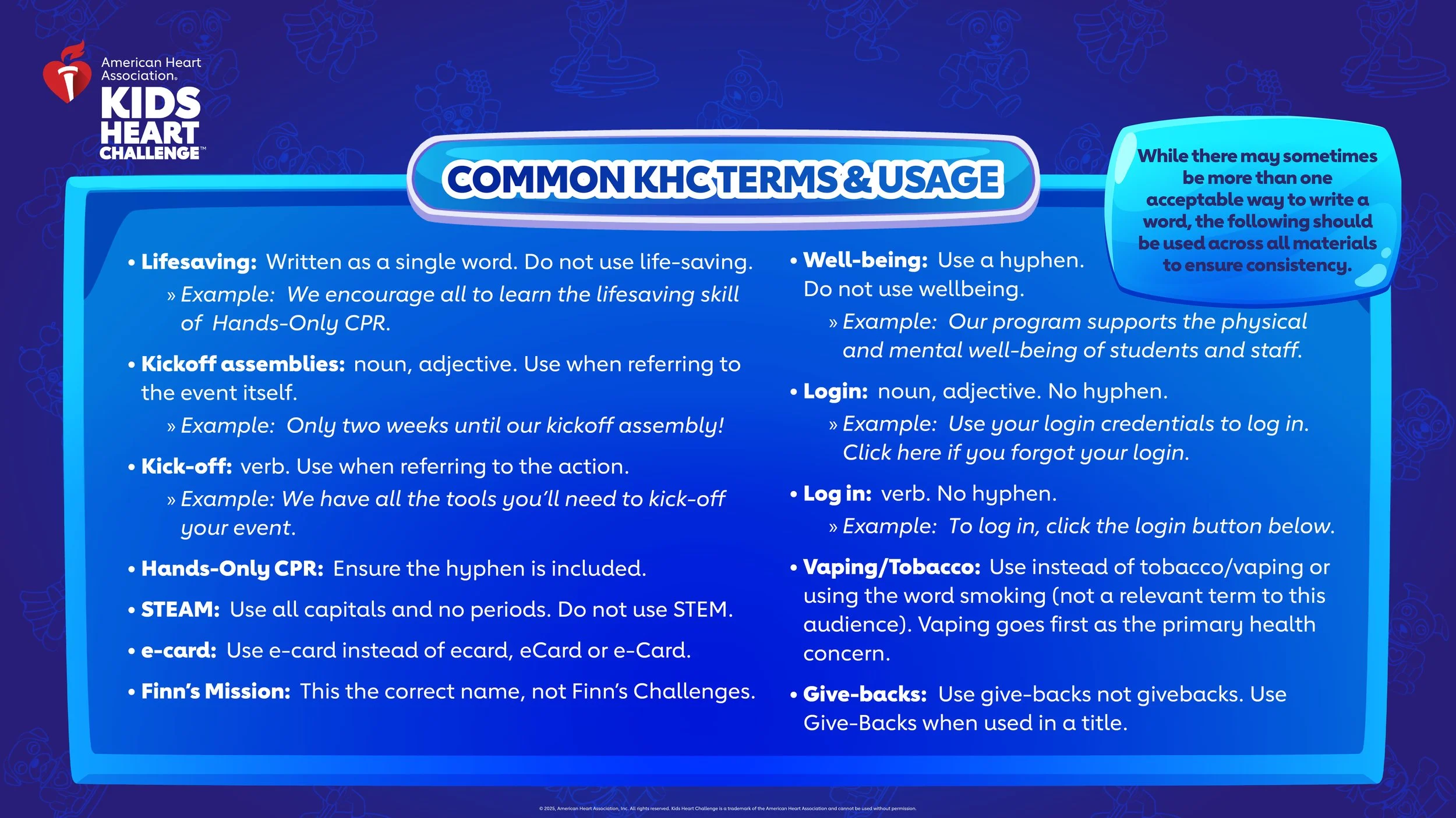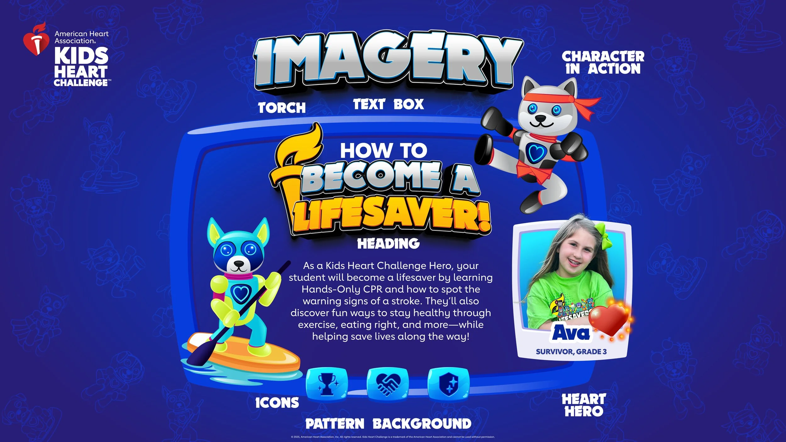 For nearly 50 years, the American Heart Association’s Kids Heart Challenge (KHC) has partnered with schools nationwide to promote heart health, teach lifesaving skills, and inspire lifelong habits. As the Creative Director for the School Engagement team, I led the creative vision across print, digital, and product design—guiding designers, copywriters, developers, and animators to deliver cohesive, emotionally resonant campaigns. Collaborating closely with executives and marketing leads, I ensured each annual campaign reflected the heart of AHA’s mission while engaging millions of students in a fresh, inspiring way.